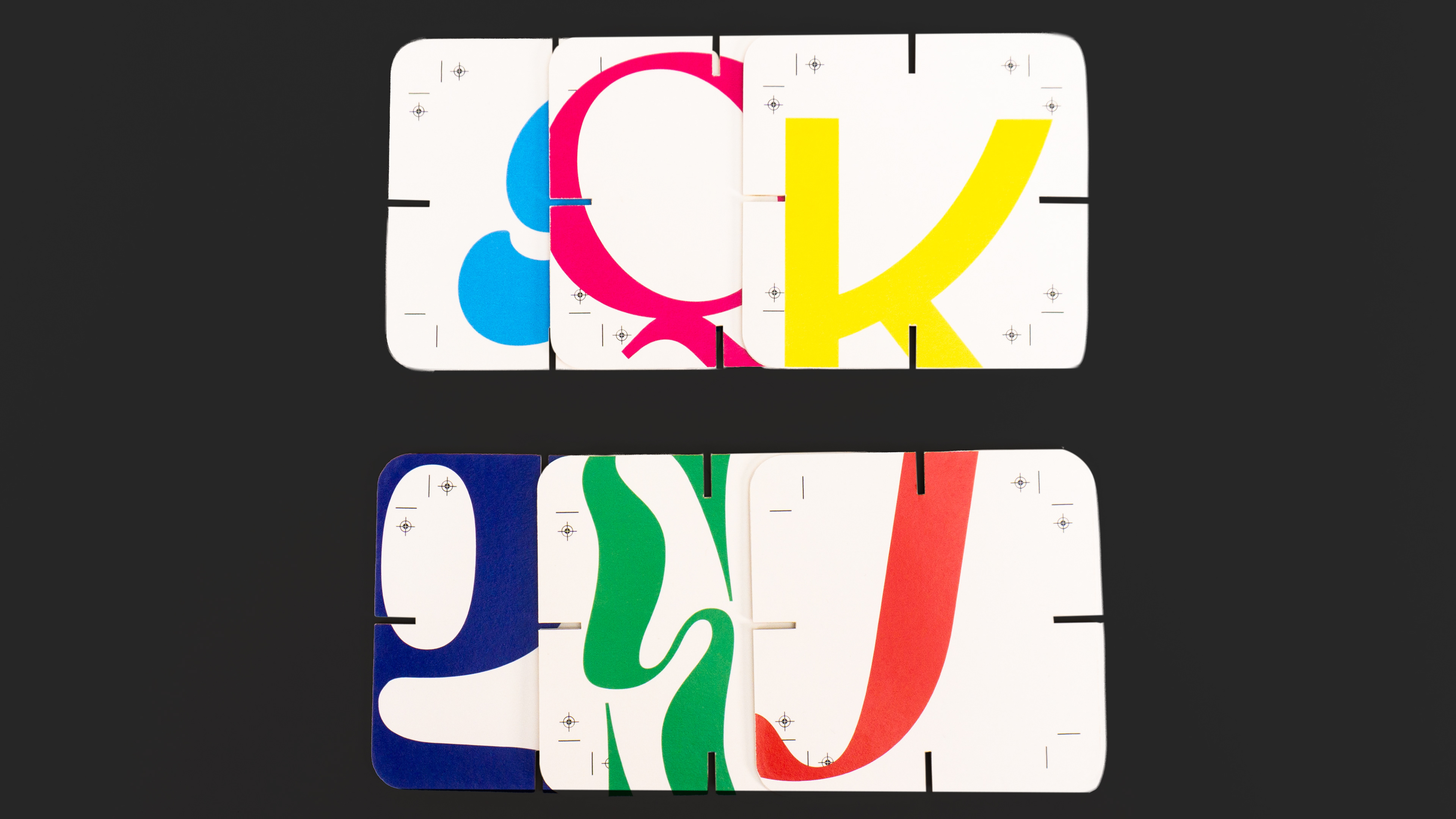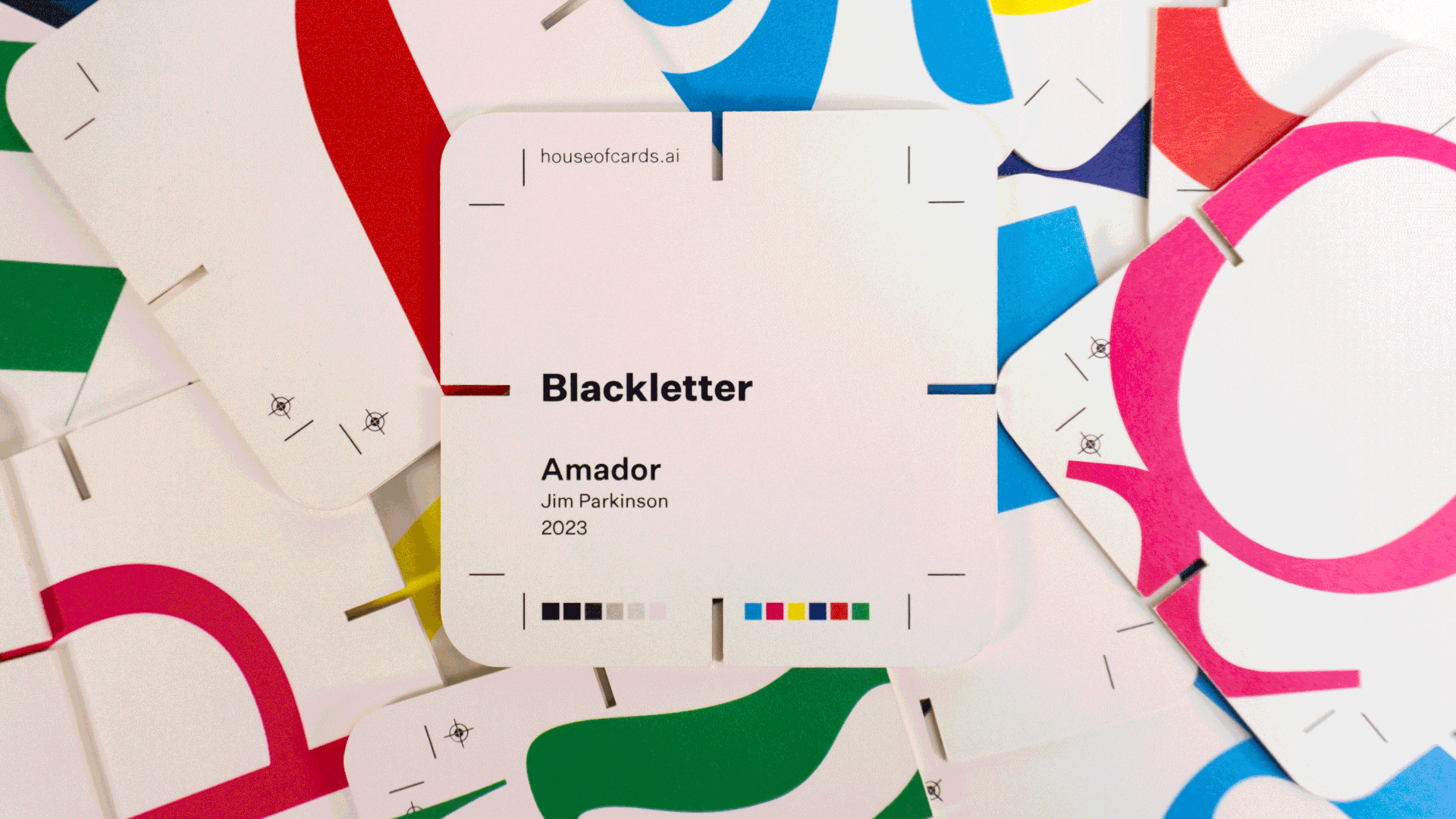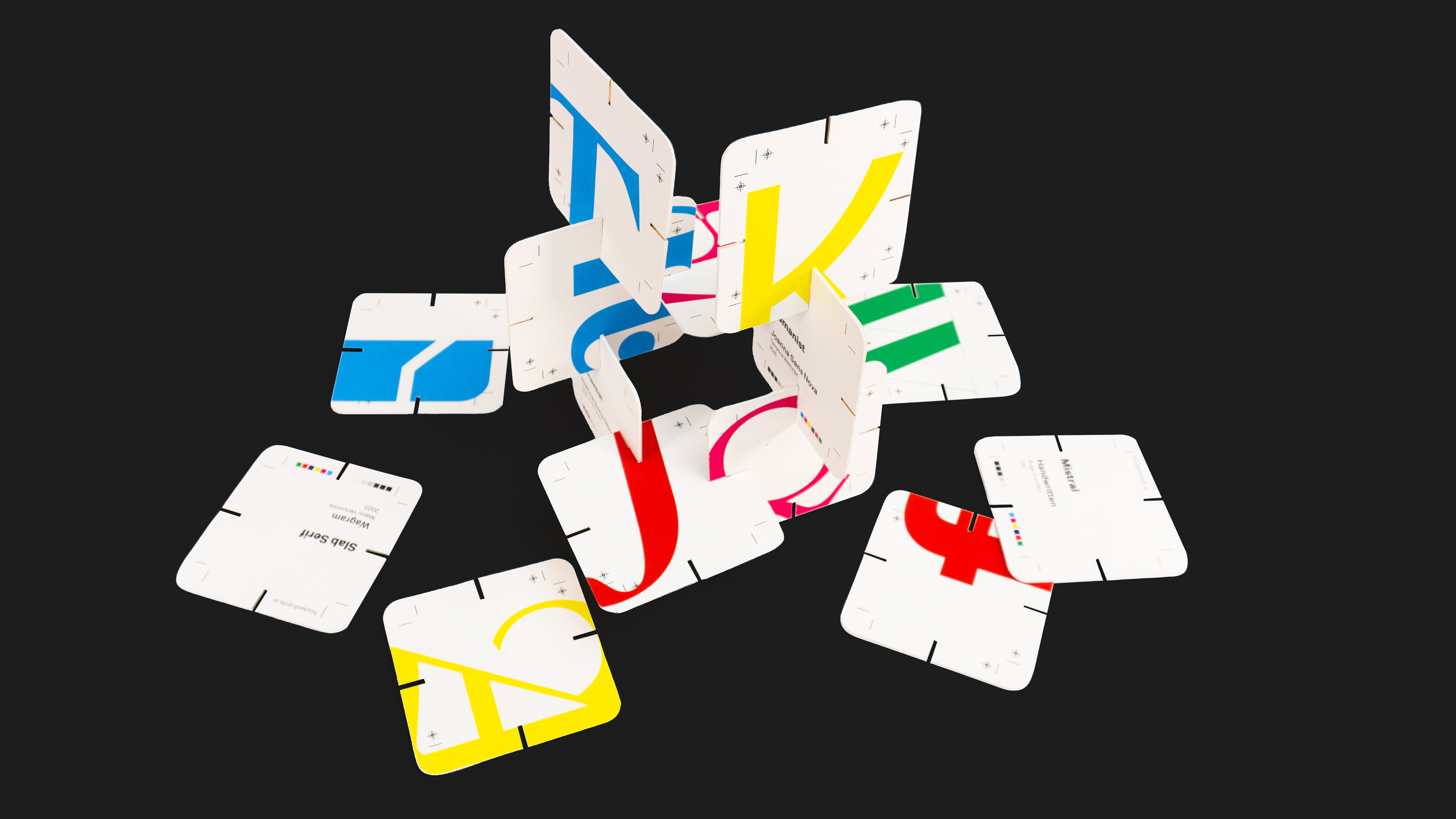House of cards is a set of 26 A-Z cards using a self-imposed set of rules to ensure cohesion and dynamism. These rules included color, composition, and a consistent labeling system and packaging that was inspired by printer marks, CMYK, and RGB color systems commonly used by designers.